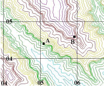 Location map for the points used for the SSO and graphs. The map has 50 m contours, color coded by elevation, and a 1 km UTM grid. Point B is located on a cliff on a SW facing slope, and Point B lies on a ridge crest that slopes downhill to the SE.