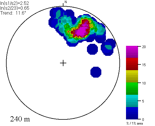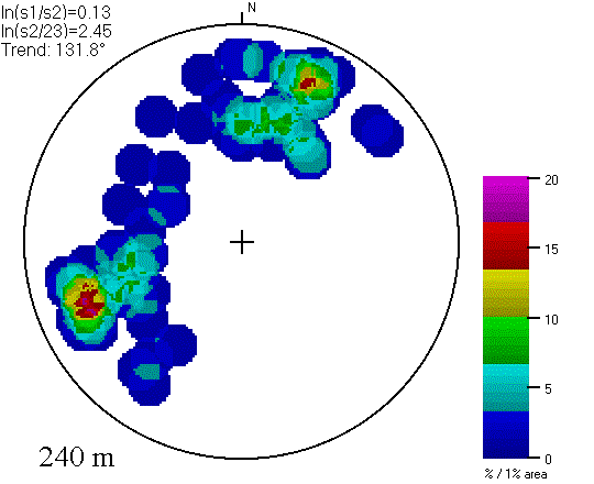Compared to the SSO diagram for the Aughwick, PA quadrangle, both of these diagrams show lower concentrations (the maximum color scale represent 20% per 1% area, compared to 30%), much steeper slopes (points plot near the edge of the diagram), and a lack of flat areas (very few points near the center of the diagram).