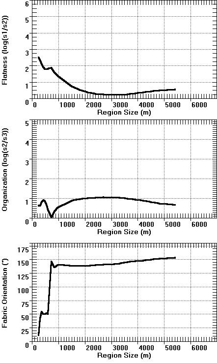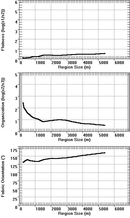 Graphs showing the effects of increasing the region size on the flatness and organization parameters, and the fabric orientation direction. Point A is on the left (or top), and Point B on the right (or bottom). For Point A note the dramatic change in the fabric at about an 800 m size. Below this region size the dominant fabric trends about 50° (NE), while for larger regions the fabric trends about 150° (SE), the same as the fabric at Point B. Compared to the graphs for the Aughwick, PA quadrangle, the Grand Canyon shows a significantly weaker fabric.