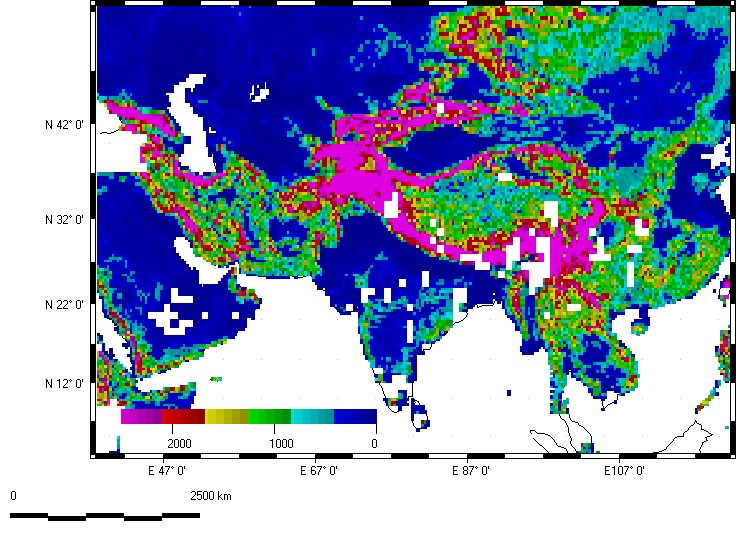 Note the highest organization in the Zagros Mountains of Iran, the Altun Shan on the north margin of the Tibet Plateau, and between India and Myanmar (former Burma). Many of these reflect folded mountains from the collisions of Arabia and India with Eurasia. The Himalayas show relatively low organization, as the rapid erosion produces nearly isotropic topography.