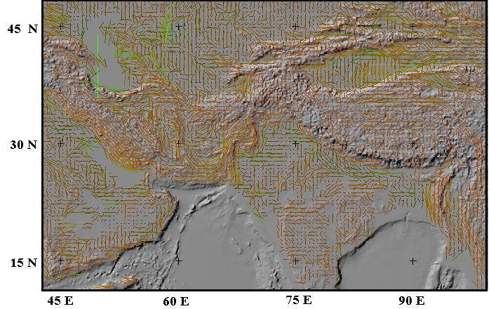 This maps shows the fabric computed from DTED level 0 draped on a reflectance map from ETOPO5. The base map includes both topography and bathymetery, whereas the fabric data only occurs over land. The lines are oriented with dominant computed fabric, with the length proportional to the strength. The color reflects a flatness vs. organization plot. Note the bright green fabrics, such as those in the Caspian Sea, have the greatest strengths but also represent the flatest topography.