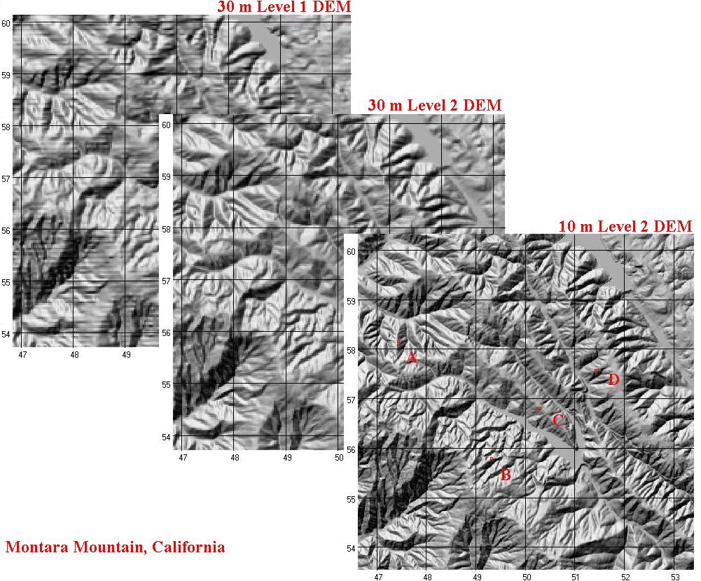 Location map for a portion of the Montara Mountain quadrangle, California. Note the increasing quality of the three DEMs from upper left to lower right; in particular note the east-west striping in the Level 1 DEM.