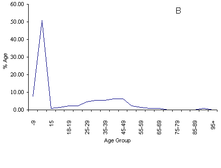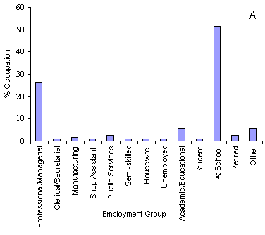 Preliminary results available for the Slaithwaite study suggest that among certain sections of the population, the web-based system was found both useful and popular. At least 126 people used the system, largely during the "Shaping Slaithwaite" event; however, there is still a considerable skew in the people prepared to use such systems, even when easily available. There is a strong (70.6% to 30.4%) male to female bias in the users. The occupation information suggests strong weighting towards those in professional/managerial and educational positions (Graph 1a), while the age distribution shows a heavy skew towards schoolchildren (Graph 1b). The latter is partly a result of educational trips to local primary schools made by the authors prior to the event, and partly reflects the inability of schoolchildren to use the 3-D map, which was too high and wide for them to reach. Although data were not collected on the mobility of the users, it was clear at the event that the PC-based maps also attracted a number of adults who found the three dimensional map difficult to use. Given the age distribution of the users it may be worth noting that once the age data was stripped from the comments, it was impossible in most cases to guess the age of the users from their suggestions, reflecting the genuine interest of all the users in their local environment.