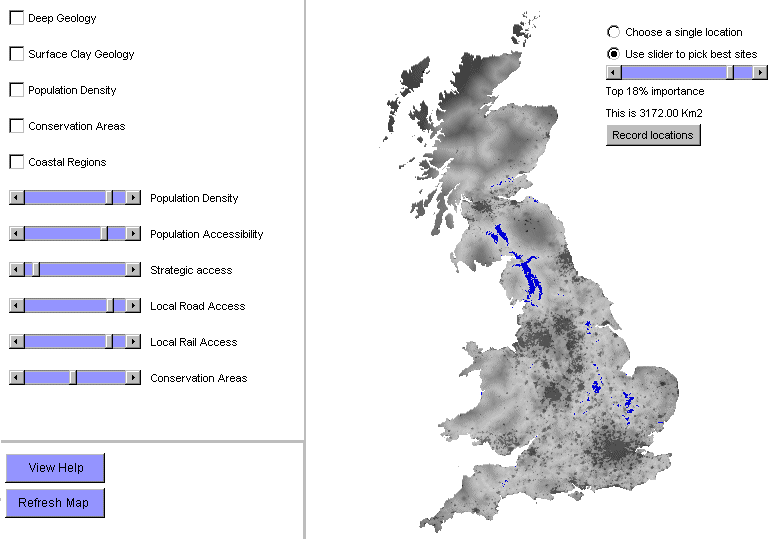 As one branch of this public participation, an online GIS-centred decision-making environment is under development with the support of NIREX, based on the system of Carver et al. (1997) (Figure 5). The software used is broadly that developed in the Yorkshire Dales National Park study. It is felt that, given the emotive nature of the problem, it is important to garner the views of users prior to them seeing their views expressed as a map of potential locations. The prospect of having NIREX as a neighbour has been known to change even the most deeply felt opinions; thus, the application again begins with a non-spatial walkthrough of the important influences, which the user is asked to weight prior to a map being generated from these weightings the user is then supplied with the ability to change the map weightings on the fly, and view a hierarchy of information and meta-information. Environmental organisations and the nuclear waste industry have been approached to provide the information, and comment on each other's information, in the hope of producing a set of data the public trusts, or at least understands the provenance of. In addition, the public has the ability to provide text information on the site, and link in this to their own web sites with multimedia contents. The same area of the decision-making environment can be used to discuss the information given by the "official" organisations. It is hoped, when the full version goes online, that there will also be an email discussion group that can be used to review the progress of the disposal programme.