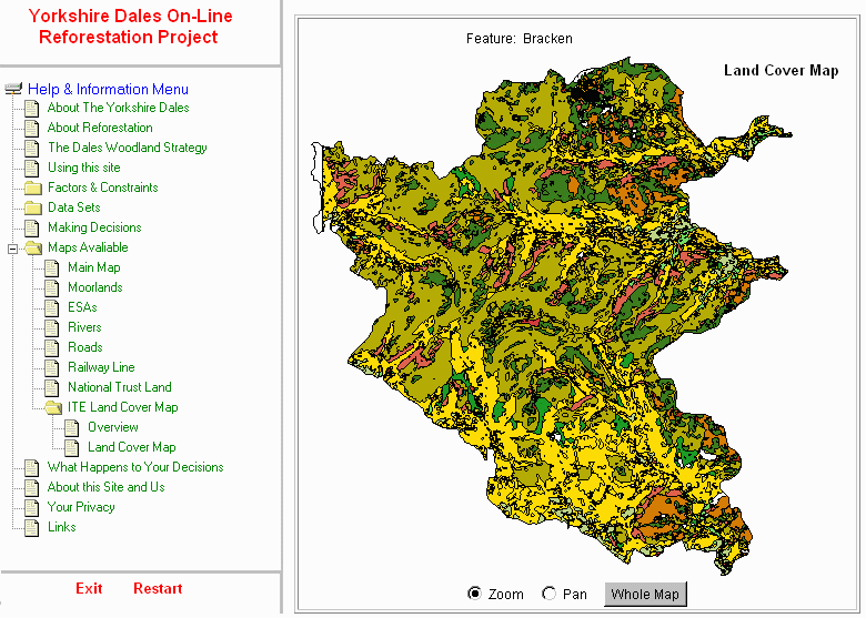 The public is first led through information on the problem and the factors that might constrain the planting locations. They are then asked how important they feel specific influences should be (for example, how important, on a sliding scale between totally important and totally pointless, are protected grassland areas?). A map of potential reforestation areas is then generated from these inputs, and stored as an example of the user's opinion prior to exposure to the GIS. The user is then allowed to regenerate the map on the fly by changing the weighting of the factors, and is allowed to set certain influences as absolute constraints (for example, areas of special scientific interest). This allows the users to experiment with hypotheses, and see the implications of their choices. At the same time, the users are allowed to browse in-depth information that is provided through a tree hierarchy, with more detailed information on each subject further down the tree. The tree system was designed to encourage the exploration of information to a level of detail to which the user felt comfortable. Meta-information also is provided on how the spatial data has been derived, its errors, and how the system works. After the user has reached an informed decision, the final weightings are recorded. As with the Slaithwaite system, demographic and usability data are collected from each user.
