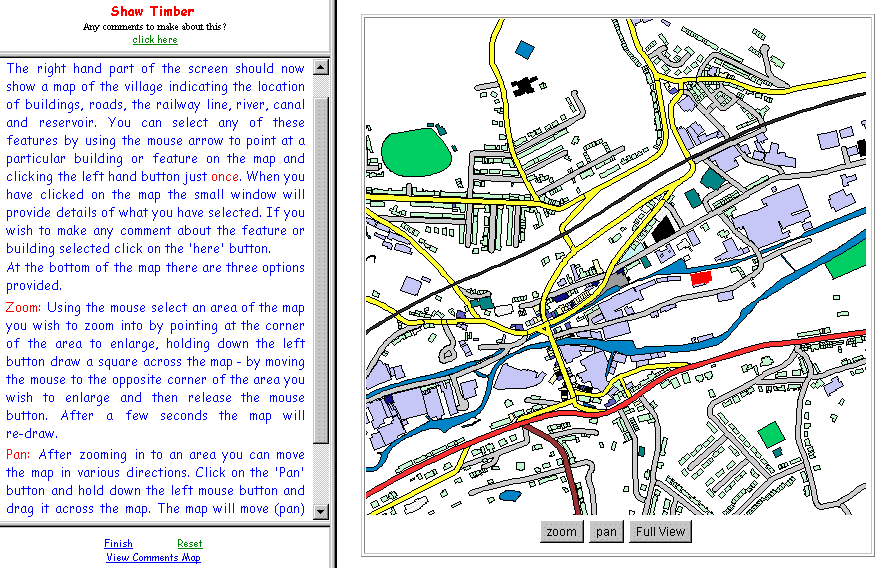 In parallel with this event, a web-based version of the map was developed (Figure 2), which was arguably among the first such system available to the public that allowed a two-way flow of spatially referenced information. To facilitate access to the web application, the authors took eight PCs running the site to the "Shaping Slaithwaite" event. The application provided a vector map of the area, which could be zoomed, panned, and on which features could be queried. If the user felt a particular feature, or area of open ground, should be developed, they could call up a form that allowed them to enter their suggestions. Demographic information and information on the users' feelings about the system also were collected. The application was implemented using the vector classes from "Geotools," a Java class package for the display and querying of ESRI shapefiles. The user responses were handled using perl server-side scripts and html forms. Unlike the PfR map, it was decided not to allow users to view other people's comments to encourage imaginative responses; however, at the end of the consultation period, the system was adjusted to allow the public to query the map for everyone's comments (Figure 3). These comments were fed into the PfR process.