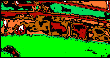 Figure 2 corresponds to the results obtained from training four networks on data sets derived from band 30 from windows of sizes 5 X 5, 7 X 7, 9 X 9, and 11 X 11, respectively. These 4 networks were applied to band 30, and as a consequence, four class maps were obtained; i.e., four networks applied to one band. Any pixel with a color other than black shows where all class maps agreed on the same label. A pixel whose color is black shows where at least one of the class maps disagreed.