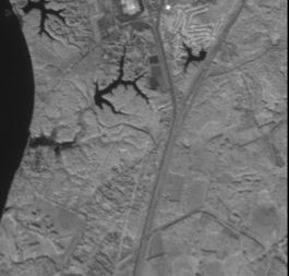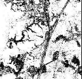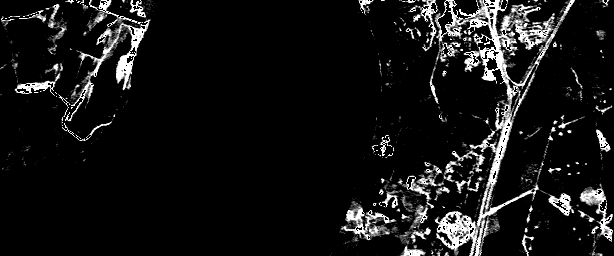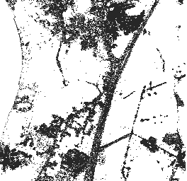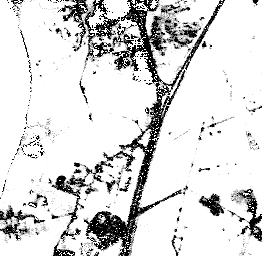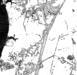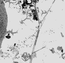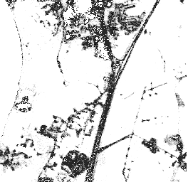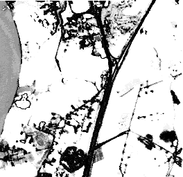 Our first strategy, combined separation, assumes only two classes, road and non-road, to create a gray scale image. Water, soil and developed areas are combined into the non-road class. Results are shown in figure 4. The combined separation strategy is also applied on the image assuming that water is excluded from the non-road class (figure 5). In the second scenario which excludes water, the noise level in the image is decreased. To make this approach useful we can add an additional step in which only water is detected and removed from the image.