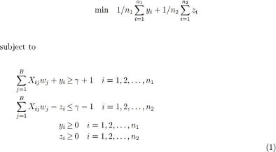 The variables in this formulation are wi, yI, zi, and . The variables wi define a hyper-plane that separates (in feature space) the observations of class 1 from those of class 2. If the two classes cannot be cleanly separated some of the variables yi, zi may be forced to take on positive values. The objective is to minimize a weighted average of the errors. The particular choice of weights shown above has the interesting property that it prevents the null hyper-plane wj = 0, , from being selected as the optimal solution (1).