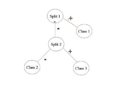 We propose a similar methodology except that we choose to split a class whose arithmetic average on the attributes is farthest, in a Euclidean sense, from the arithmetic average of all classes. There are two types of nodes in the tree: split nodes and terminal nodes. Each split node is associated with a linear programming split, as described above, and has two children in the tree, one a terminal node and the other a split node. Each terminal node is associated with a class label, and has no children. An example decision tree is shown in Figure 3. In growing a tree, we maintain a set of active classes (i.e., classes which are not yet associated with a terminal node). Initially, all classes are active. The root node of the tree is always a split node that corresponds to an attempt to separate a single active class from the remaining set of active classes. One child of the root is a terminal node with the class label of the class that we are attempting to separate from the other active classes. The other child of the root is a split node that may be viewed, recursively, as the root node for a subtree with one less active class. At any level of this process, the class that is chosen for separation is that active class whose average pixel intensities are the furthest from the average pixel intensity for all other active classes combined. In the linear programming formulation, the active class we are attempting to separate forms class 1, while class 2 is the set of remaining active classes.