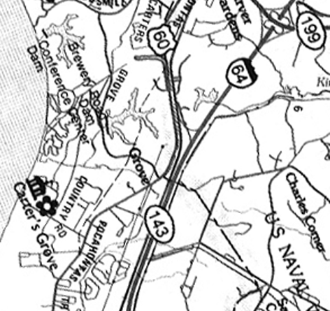 Our training data set was taken from an AVIRIS image of an area south of Williamsburg, Virginia. This image consists of pixels. For each pixel, image intensity is recorded to a precision of 16 bits for each of 224 bands of the electro-magnetic spectrum. The ground resolution of the image is 17m. To enhance the contrast between different features of the image as part of a preliminary visual inspection, we extracted bands 20, 50 and 70 from the AVIRIS image and used them as the red, green, and blue bands of the false-color image shown in Figure 1. Certain features are apparent from the false-color image and from the map shown in Figure 2. One of the major roads is the interstate highway I-64, which runs approximately vertically in the center of the image. The large body of water which is visible to the left is the James River. Other major features include areas of development, such as the portion of Williamsburg seen at the top center of the image, and the large tracks of vegetation or bare soil seen to the right in the image. It seems reasonable, then, to identify four potential classes for each pixel: road, water, soil, or developed area.