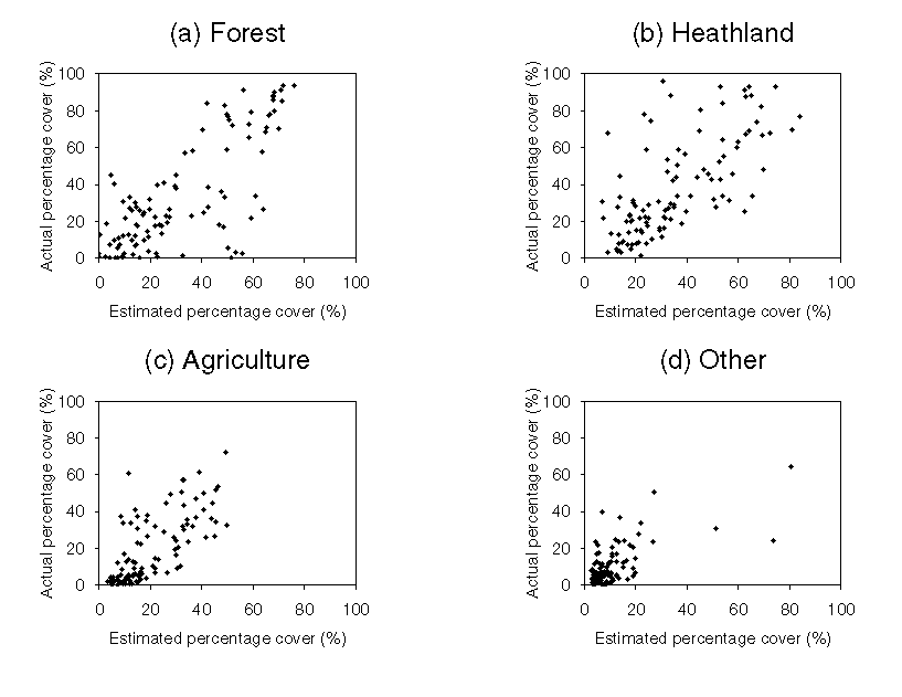 In summary, initial results suggest that the RMS error, standardized by some measure of the variances in the bivariate distribution, provides an interesting alternative to the correlation coefficient. Further, it would appear that the kernel-based approach presented above does have something to offer, particularly where the distribution of proportions to be estimated is bimodal. The choice of statistic to represent accuracy, or more likely the combination of statistics, will depend ultimately on what the user perceives to be important accuracy criteria.