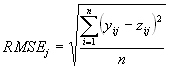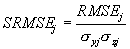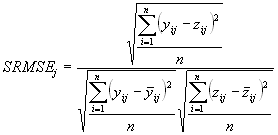 The standardized RMS error varies greatly between distributions. Take the expected value of one as a benchmark. The first distribution with SRMSEj of 0.88 indicates slightly better estimation than can be achieved with the mean of the target distribution. The biased estimates (Figure 5b and c) have much larger values and this is desirable. The fourth distribution (Figure 5d) also has a large SRMSEj value. The desirability of this is debatable; however, it does reflect the lack of association between the two variables, which the RMS error does not. Finally, the SRMSEj for the bimodal distribution is less than half that for the benchmark. This highlights the problem of standardizing the RMS error (or any other statistic) with the variance of a bimodal distribution. The value is deflated and does not represent the level of association (r of near zero) within the bimodal clusters near to (0,0) and (1,1).