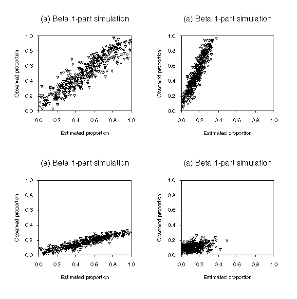 Figure 6. Simulated bivariate distributions representing four common scenarios for remotely sensed estimates of land cover proportions. The method used to draw the realizations is explained in the text.