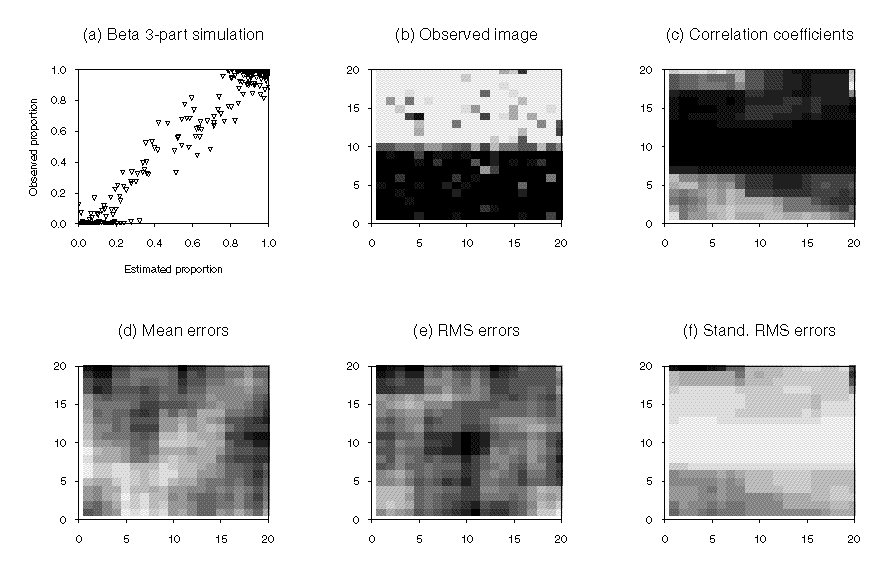 m =0.95 and s 2=0.01, the tenth row simulated with m =0.5 and s 2=0.02, and the final ten rows simulated with m =0.05 and s 2=0.02 (Figure 6a). These choices were made to simulate a boundary of mixed pixels as would be common at the water-land interface discussed above.The r statistic, the mean error, the RMS error and the standardized RMS error were computed for each simulated data set. The results are given in Table 5. In addition, a kernel of 7 by 7 pixels was applied to the images and the statistics calculated again within the moving window. This led to images of statistics, some of which are shown for the fifth (water-land) simulated data set in Figure 6b-f. These values were averaged to estimate kernel-based versions of the standard ones and these are given in Table 5.