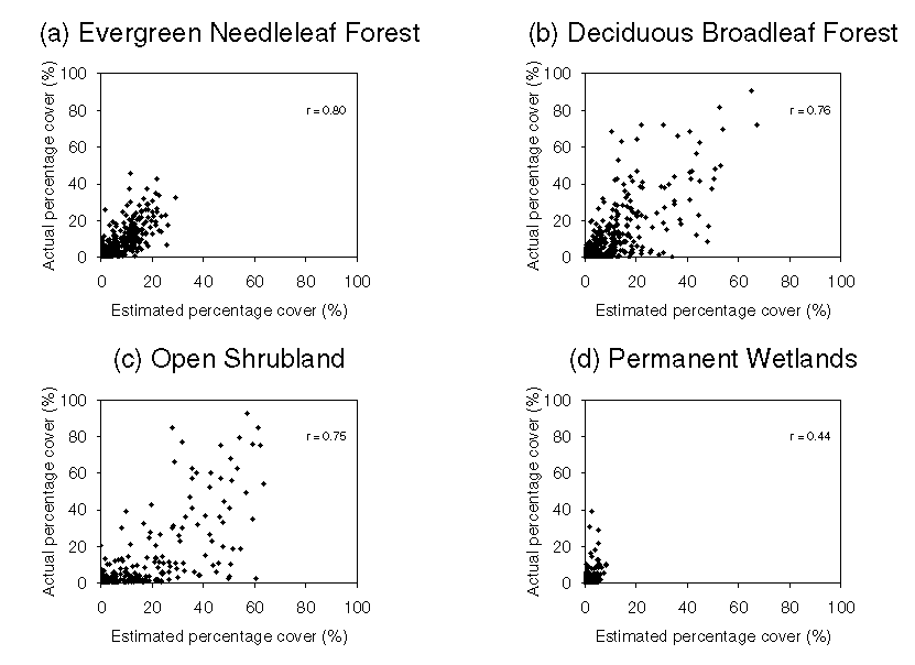 Table 3a. Mean errors for estimating the sub-pixel proportions of Evergreen needleleaf forest, Deciduous broadleaf forest, Open shrubland, Permanent wetlands, Croplands, Urban and built-up, Barren or sparsely vegetated and Water.