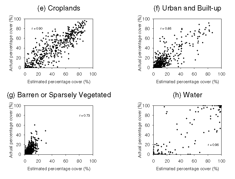 This time, the ANN only was used to estimate the eight classes: the fuzzy c-means classifier was already inaccurate for four classes, and the mixture model could not be used to estimate more classes than there were wavebands. The results (Figure 2, Table 3) showed that an ANN (and a single NOAA AVHRR image) could be used to estimate the proportional land cover for eight classes, thereby providing data with which to populate a fuzzy global land cover map.