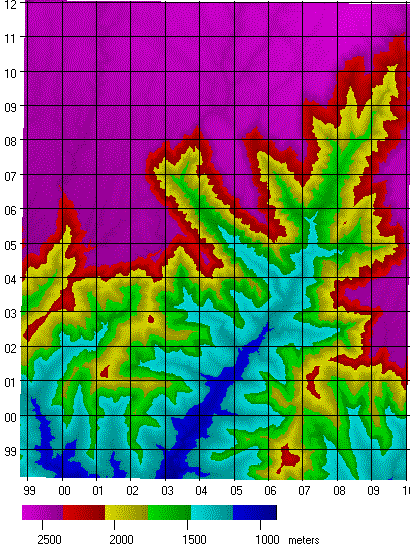 The lowest organization values occur in the major streams, because of the competing effects effects of the stream, and the ridges oriented perpendicular to the stream.