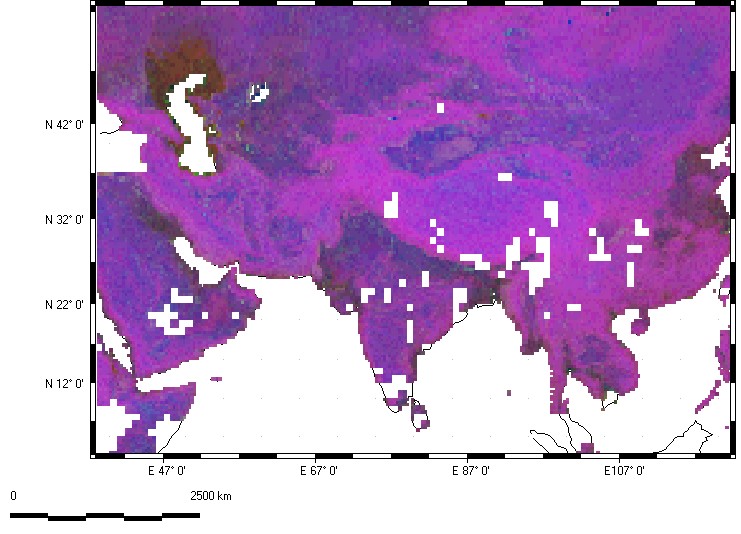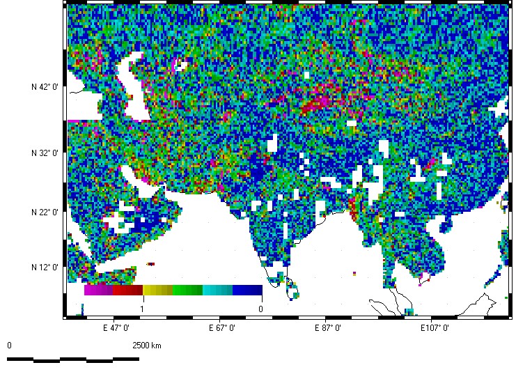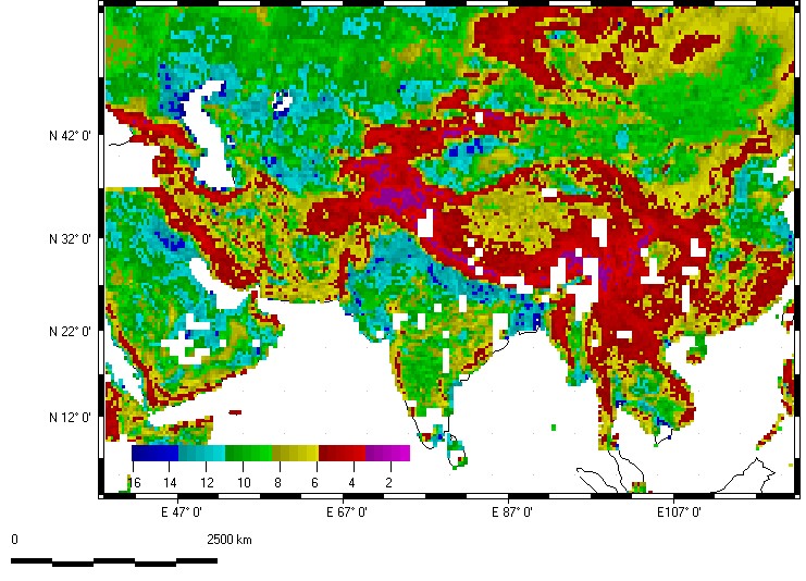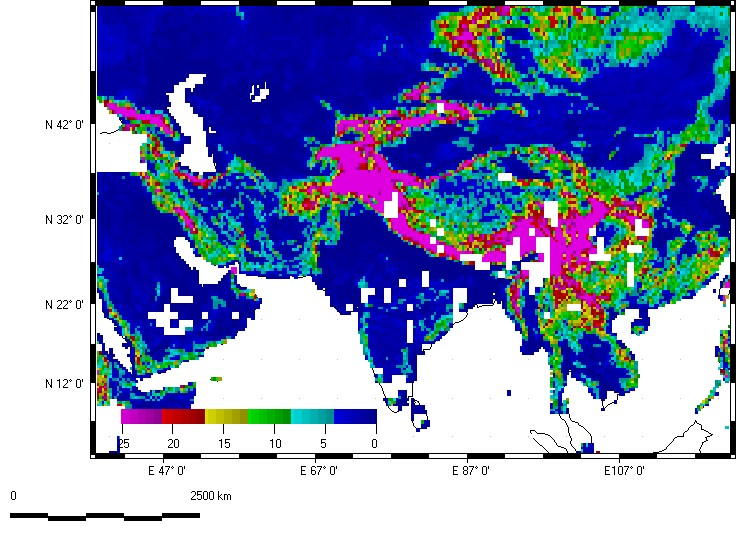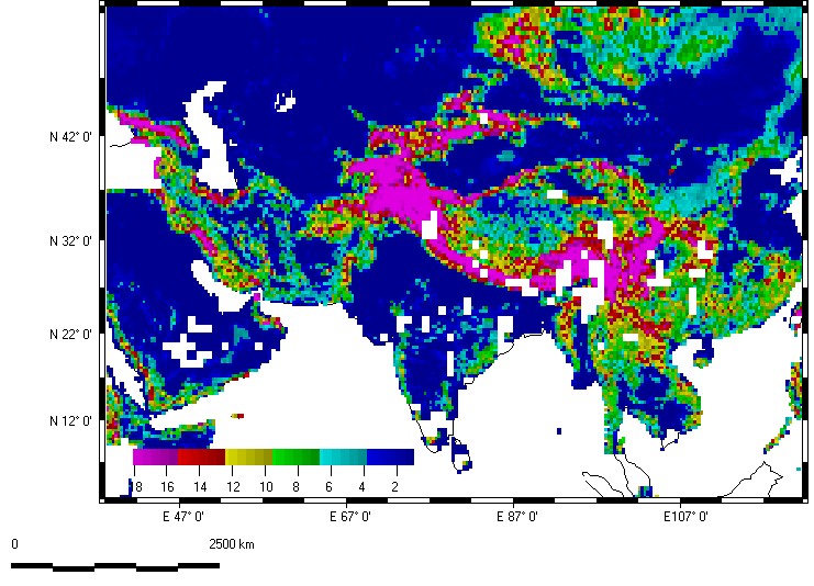 Note the highest organization in the Zagros Mountains of Iran, the Altun Shan on the north margin of the Tibet Plateau, and between India and Myanmar (former Burma). Many of these reflect folded mountains from the collisions of Arabia and India with Eurasia. The Himalayas show relatively low organization, as the rapid erosion produces nearly isotropic topography.
