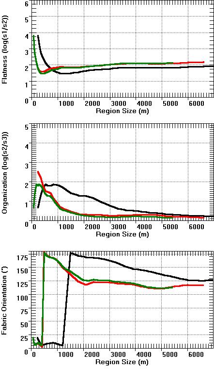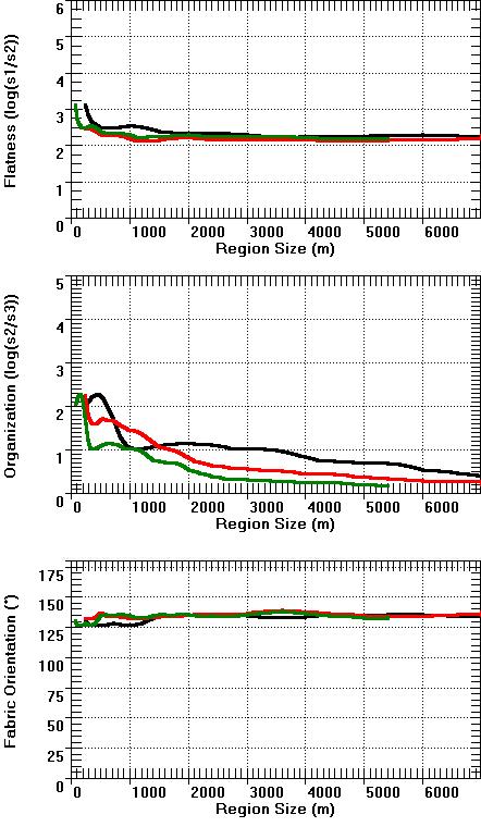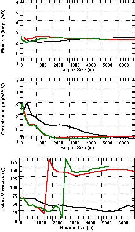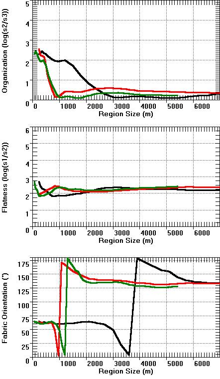 Note the general agreement between the 3 DEMs, especially the two Level 2 DEMs. In many cases the parameters have a significant trend in the organization parameter and fabric directions with a region size of about 1000 m, which represents a major shift from local to more regional fabric.