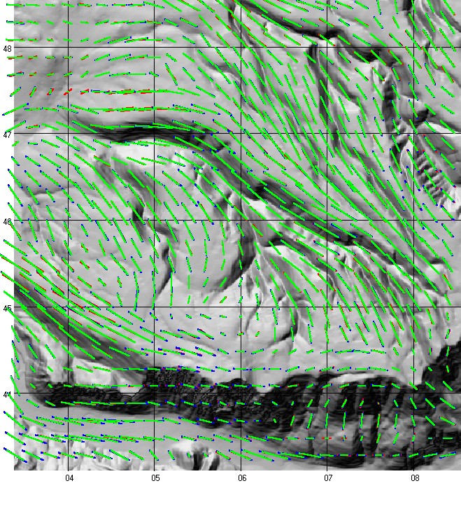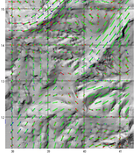 Note that different parts of the map show different color patterns. The west side has almost none of the red (Level 1) fabric showing, showing that it generally agrees very closely with the other two DEMs. The level 1 DEM shows much greater differences on the eastern half of the map. The blue and green (the two Level 2 DEMs) generally have the same orientation, but the 30 m DEM often has a slightly stronger organization parameter. The largest differences in orientation generally occur where the strength of the fabric is smallest.